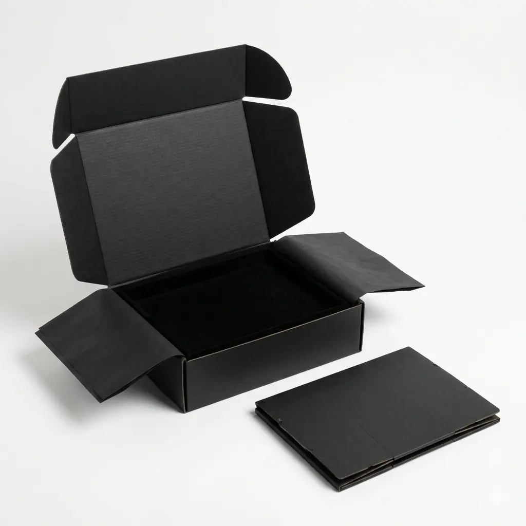 All black mailer boxes arrive flat, stack well and fold to shape quickly at the packing bench.