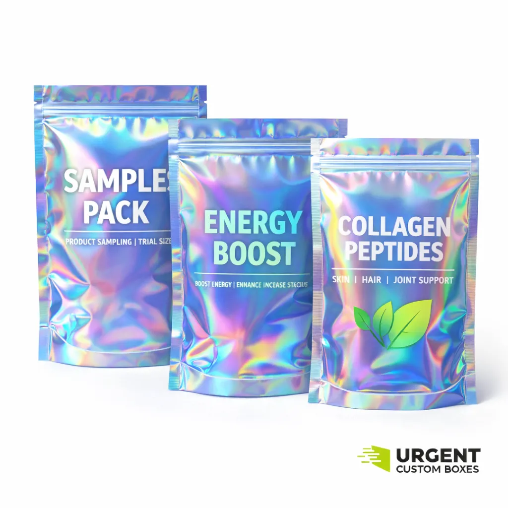 Custom holographic Mylar bags are high-barrier pouches made with holographic or iridescent films and laminates. They protect products like normal Mylar while adding a shifting, rainbow effect that changes with light and angle for a premium, eye-catching look on shelves and screens.