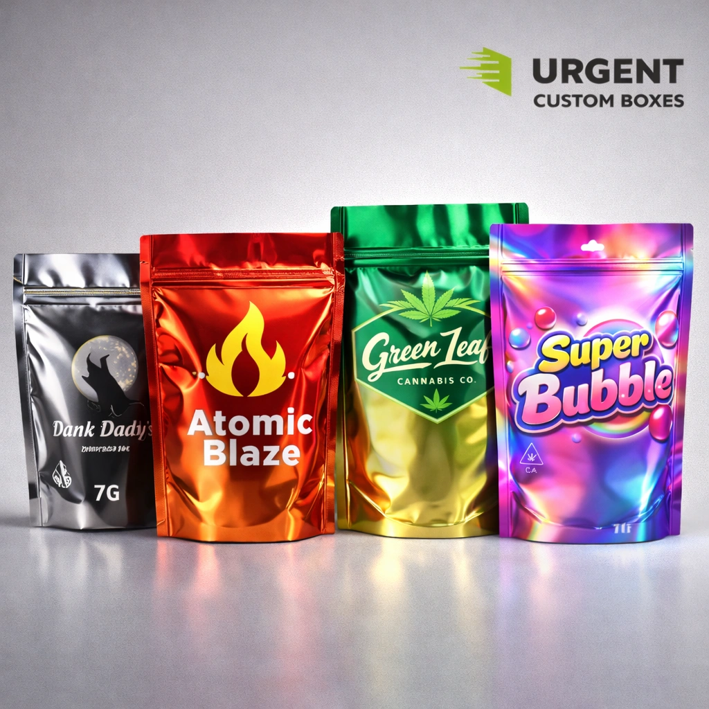 Urgent Custom Boxes customizes metalized Mylar bags by matching size, format, laminate, closures, finishes and print layouts so one metalized system can support multiple SKUs with consistent structure.