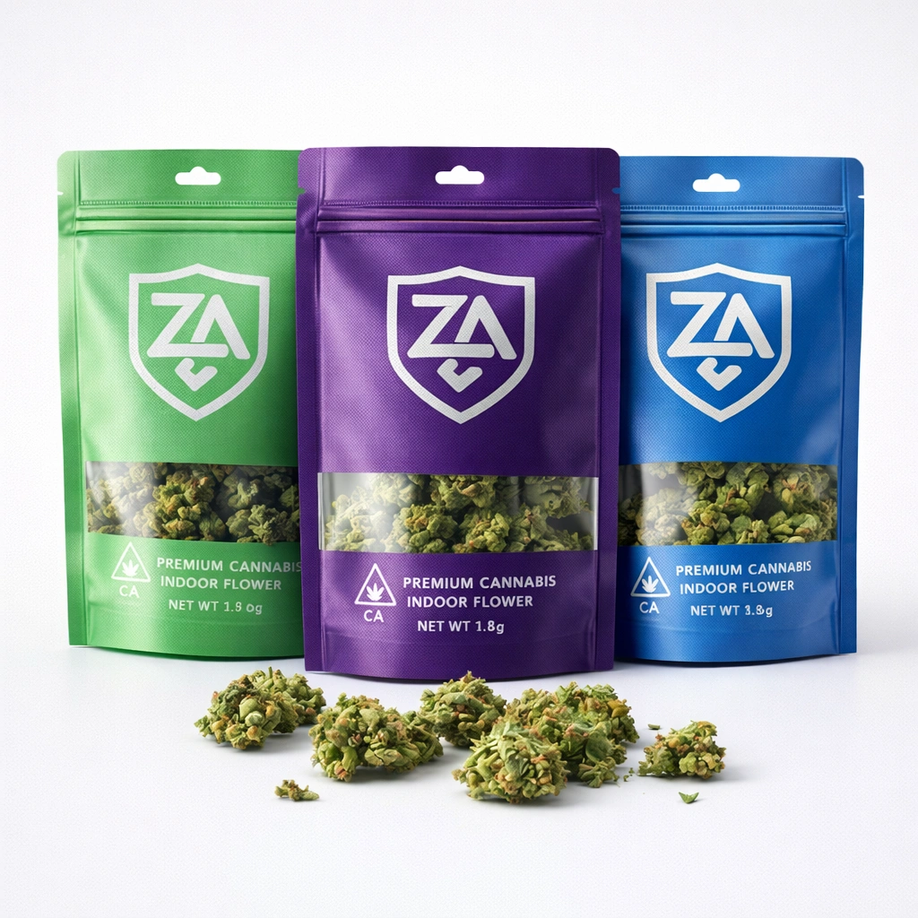 Za bags reserve fixed zones for warnings, age marks, THC symbols, strain names, potency and batch data, while artwork lives around those zones, keeping packs readable for regulators, budtenders, customers.