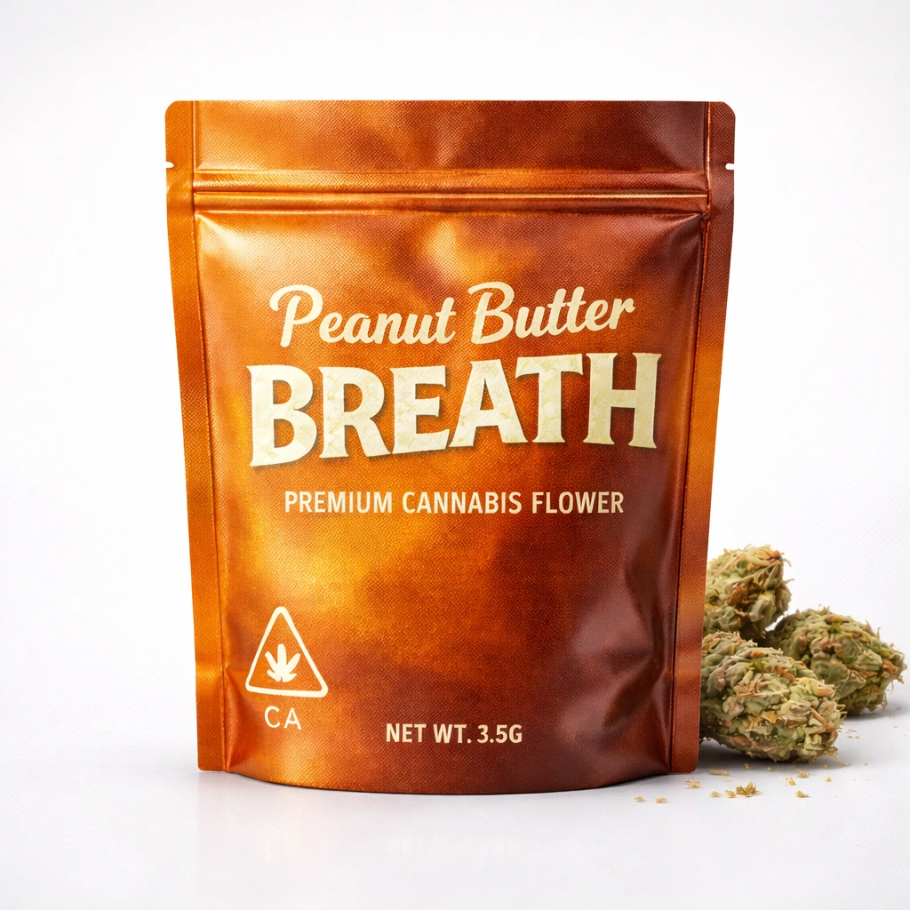 Peanut Butter Breath Mylar bags are printed pouches sized and branded for Peanut Butter Breath and PB Breath cross strains. They lock in terpenes and structure while carrying your logo, strain name, flavor cues, effects, dosage and all mandatory compliance details in a single, sealed pack.