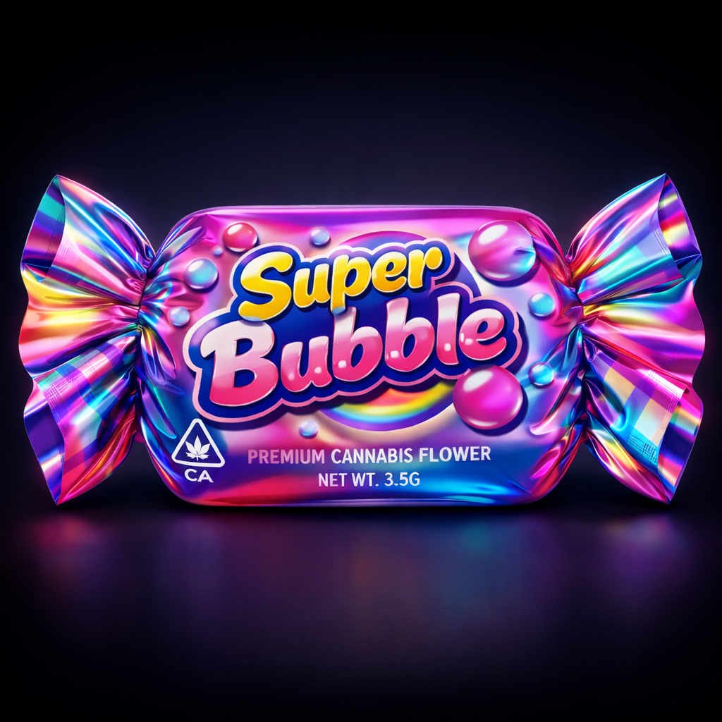 Strain-branded Super Bubble 3.5g bags separate this candy-gas strain from house flower. They create a consistent layout for branding and compliance. Buyers recognize Super Bubble instantly online and in-store instead of seeing unmarked generic Mylar bags.